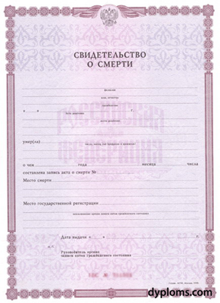 Приобрести свидетельство о смерти и не проходить всю процедуру по его оформлению зачастую намного выгоднее, к тому же это можно сделать прямо сейчас на нашем сайте. Данный документ является достаточно значимой официальной бумагой, особенно для родственников умершего человека. При вступлении в наследство свидетельство о смерти играет важную роль, ведь в случае отсутствия данного документа Вы не сможете воспользоваться своими правами на наследуемое имущество, а также юридически переоформить какие-либо бумаги, например на право собственности недвижимым имуществом.